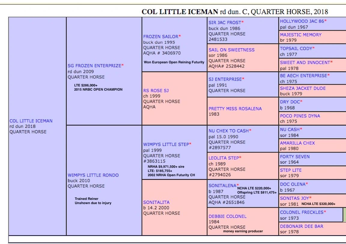 By SG Frozen Enterprize, winner of the 2015 NRBC Classic Level 4 Open, (NRHA LTE $274,000+) out of a daughter of Wimpys Little Step (out of a grand daughter of Colonel Freckles, Doc O'Lena, and Sonitas Joy (NCHA LTE $320K+);