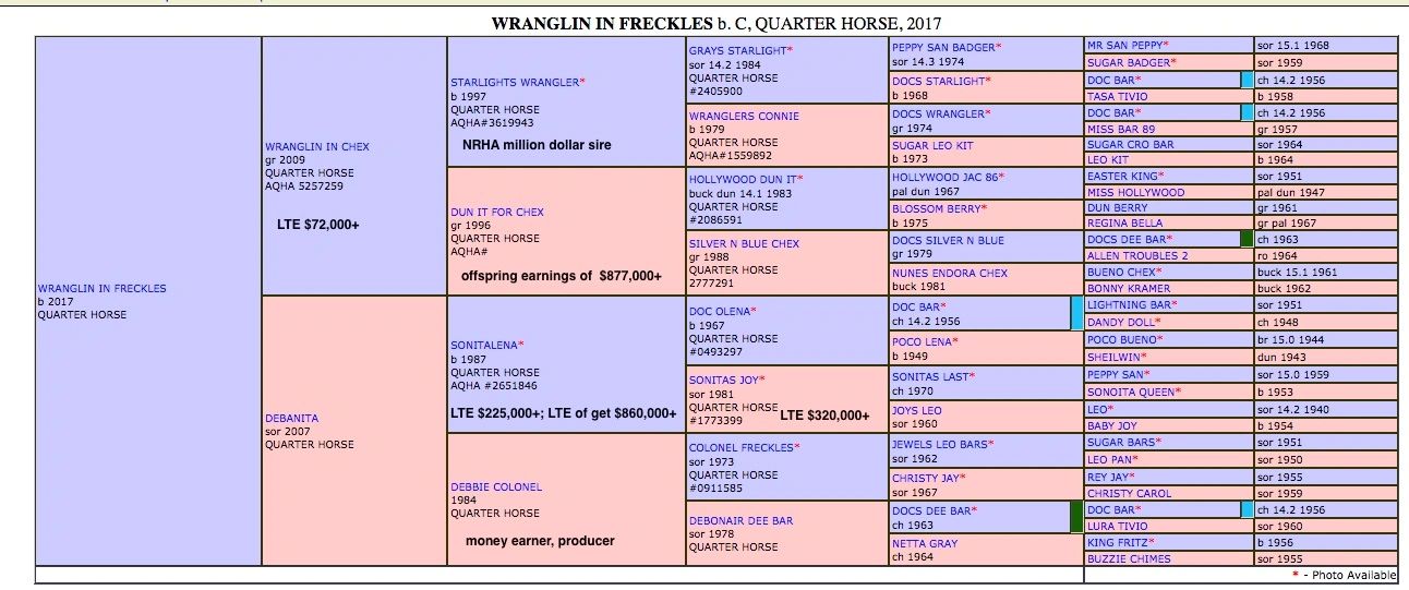 Dam is Debanita, a daughter of NCHA World Champion, Sonitalena ( LTE $225,000; LTE of get $860,000+) out of a money earning, producing daughter of Colonel Freckles.